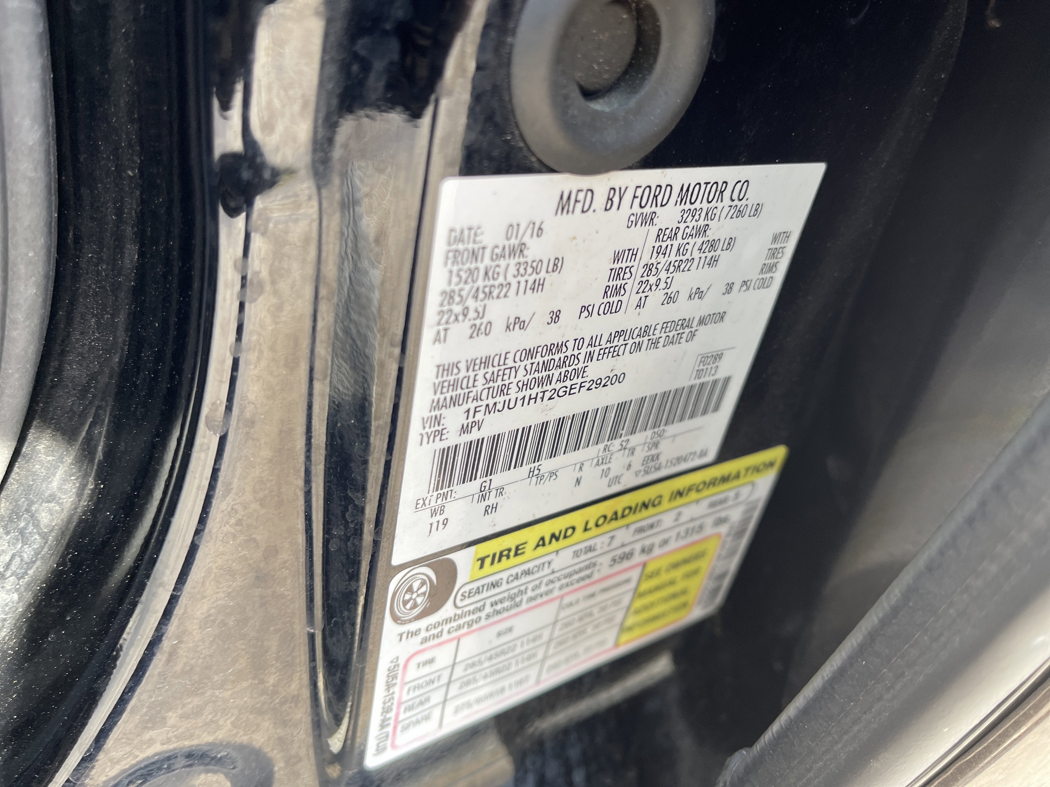 Equipped with GVWR: 7,300 lbs Payload Package, 2nd Row Bucket Seats, 3.15 Axle Ratio, 3rd row seats: split-bench, 4-Wheel Disc Brakes, ABS brakes, Adjustable pedals, Air Conditioning, Alloy wheels, AM/FM radio: SiriusXM, Auto-dimming Rear-View mirror, Automatic temperature control, Brake assist, Bumpers: body-color, CD player, Compass, Delay-off headlights, Driver door bin, Driver vanity mirror, Dual front impact airbags, Dual front side impact airbags, Electronic Stability Control, Emergency communication system: 911 Assist, Exterior Parking Camera Rear, Four wheel independent suspension, Front anti-roll bar, Front Bucket Seats, Front Center Armrest, Front fog lights, Front reading lights, Fully automatic headlights, Garage door transmitter, Heated door mirrors, Illuminated entry, Leather steering wheel, License Plate Bracket, Low tire pressure warning, Occupant sensing airbag, Outside temperature display, Overhead airbag, Overhead console, Panic alarm, Passenger door bin, Passenger vanity mirror, Power door mirrors, Power driver seat, Power Liftgate, Power Moonroof, Power steering, Power windows, Radio data system, Radio: Premium Sony Sound System w/Single-Disc/MP3, Rear air conditioning, Rear anti-roll bar, Rear audio controls, Rear reading lights, Rear window defroster, Rear window wiper, Remote keyless entry, Roof rack, Security system, Speed control, Speed-sensing steering, Speed-Sensitive Wipers, Split folding rear seat, Steering wheel mounted audio controls, SYNC 3 Communications & Entertainment System, Tachometer, Telescoping steering wheel, Tilt steering wheel, Traction control, Trip computer, Variably intermittent wipers, Voltmeter, and Wheels: 20 Bright Machined Aluminum.
